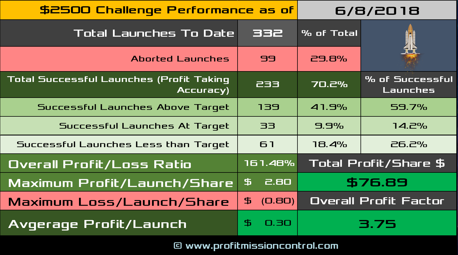 Here is the latest update to the $2500 Launch List Performance Card. Since the start on 12/8/2017 332 Launches, 70.2% Accuracy with an average Profit/Launch of $0.30/Launch. On a per share basis for the challenge start to date the Profit per Share was $76.89/Share. If you multiply that Profit Per Share times the average number of shares per trade (currently sitting at about 366 shares), that will give you the total approximate profit on the challenge so far. Overall Profit/Loss ratio was 161.48% and the Overall profit factor is 3.75 to date.