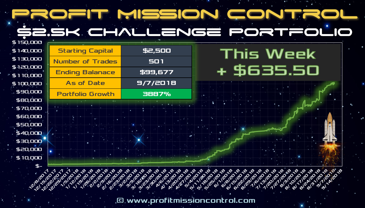 This is cumulative portfolio growth chart that captures the profit on a weekly basis from the $2500 challenge start trading a variable number of shares per trade. This chart only contains the trades that are launched based on the Launch List published on the site.  The profit growth does not include intraday day calls from our intraday alerts.  The portfolio growth is based on actual entries and exits from the Launch List that are published on the site, StockTiwtsTwitter and Facebook and are traded using our SureTrader Platform.  Our goal is not to brag about profits whether they are real or not, our goal is to track a winning system that generates profits based on transparent Launch plans that are published 2-5 times a week.