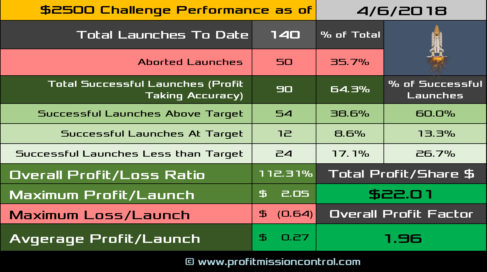 Here is the latest update to the $2500 Launch List Performance Card. Since the start on 12/8/2017 140 Launches, 64.3% Accuracy with an average Profit/Launch of $0.27/Launch. On a per share basis for the challenge start to date the Profit per Share was $22.01/Share. If you multiply that Profit Per Share times the average number of shares per trade (currently sitting at about 132 shares), that will give you the total profit on the challenge so far. Overall Profit/Loss ratio was 112.31% but the Overall profit factor is 1.96 to date.