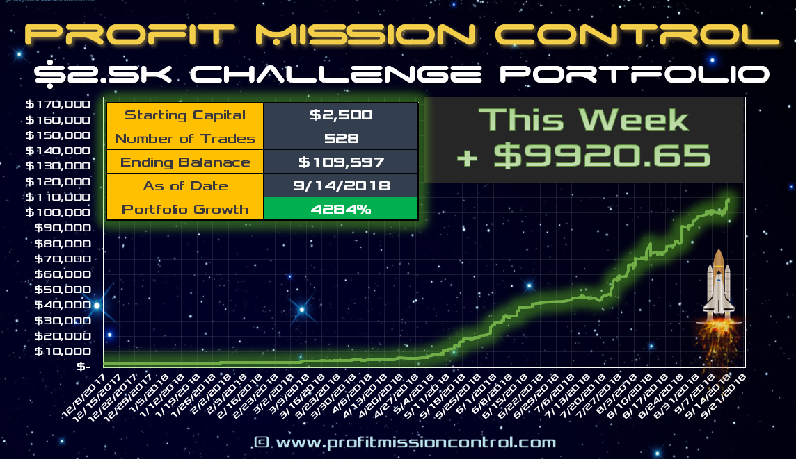 This is cumulative portfolio growth chart that captures the profit on a weekly basis from the $2500 challenge start trading a variable number of shares per trade. This chart only contains the trades that are launched based on the Launch List published on the site. The profit growth does not include intraday day calls from our intraday alerts. The portfolio growth is based on actual entries and exits from the Launch List that are published on the site, StockTiwts, Twitter and Facebook and are traded using our SureTrader Platform. Our goal is not to brag about profits whether they are real or not, our goal is to track a winning system that generates profits based on transparent Launch plans that are published 2-5 times a week.