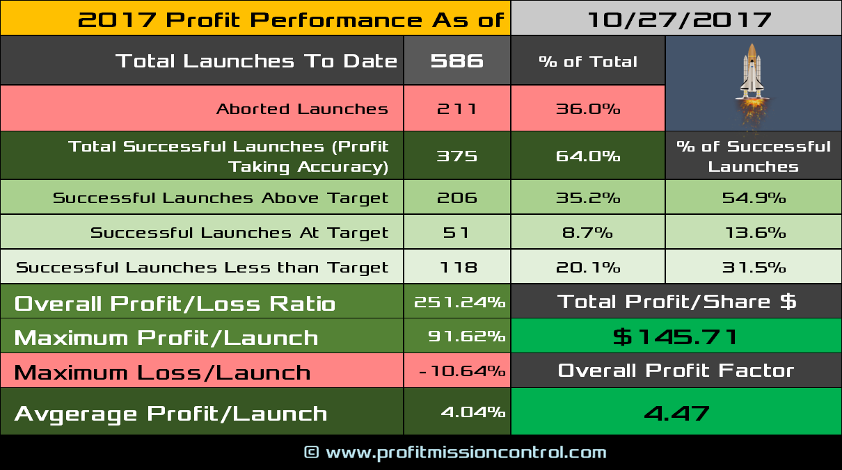 Here is the latest update to the Launch List Performance Card.   To date 586 Launches, 64% Accuracy with an average Profit/Launch of 4.04%.  On a per share basis for the year to date the Profit per Share climbed to $145.71.  If you multiply that Profit Per Share times the number of shares per trade, that will give you the total profit per year.  Overall Profit/Loss ratio was 251.24% and the Overall profit factor is 4.47 for the year.