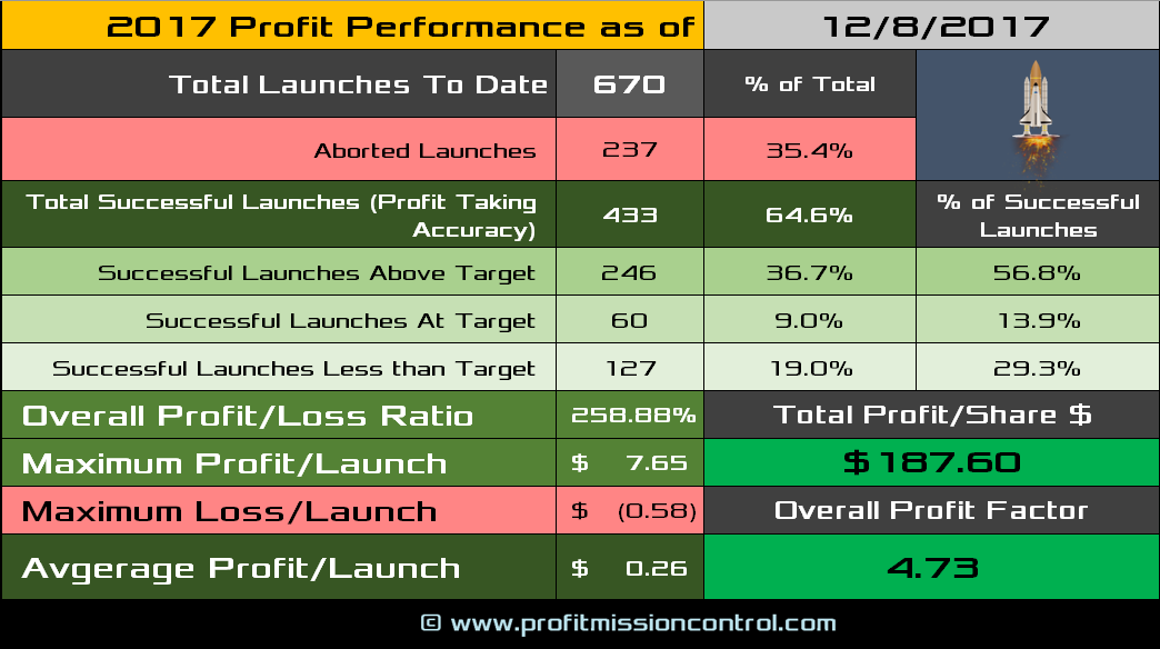 Here is the latest update to the Launch List Performance Card. To date 670 Launches, 64.6% Accuracy with an average Profit/Launch of $0.26. On a per share basis for the year to date the Profit per Share climbed to $187.60. If you multiply that Profit Per Share times the number of shares per trade, that will give you the total profit per year. Overall Profit/Loss ratio was 258.88% and the Overall profit factor is 4.73 for the year.