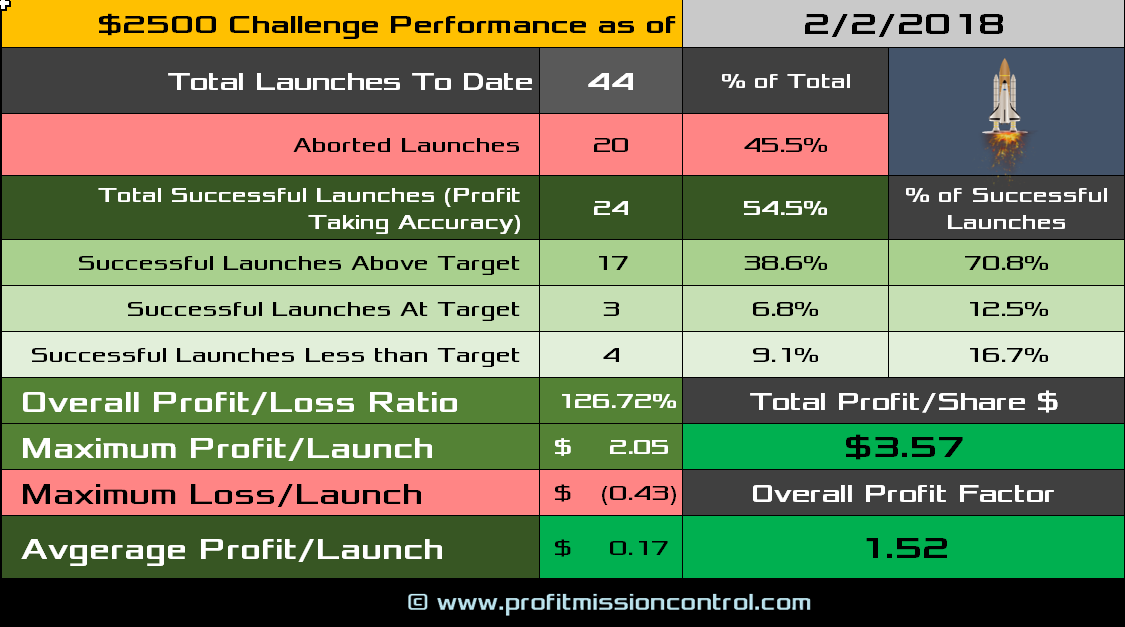 Here is the latest update to the $2500 Launch List Performance Card. Since start on 12/8/2017 44 Launches, 54.5% Accuracy with an average Profit/Launch of $0.17/Launch. On a per share basis for the challenge start to date the Profit per Share was $3.57/Share. If you multiply that Profit Per Share times the average number of shares per trade (currently sitting at about 153 shares), that will give you the total profit on the challenge so far. Overall Profit/Loss ratio was 126.72% and the Overall profit factor is 1.52 to date.